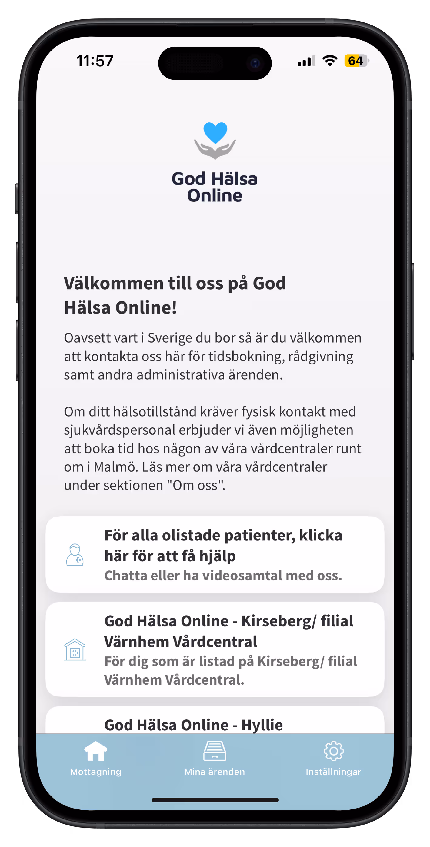 Med vår digitala app kan du få den vård du behöver, när du behöver den, utan att lämna hemmet. Om ditt hälsotillstånd kräver fysisk kontakt med sjukvårdspersonal erbjuder vi även möjligheten att boka tid hos någon av våra vårdcentraler runt om i Malmö.